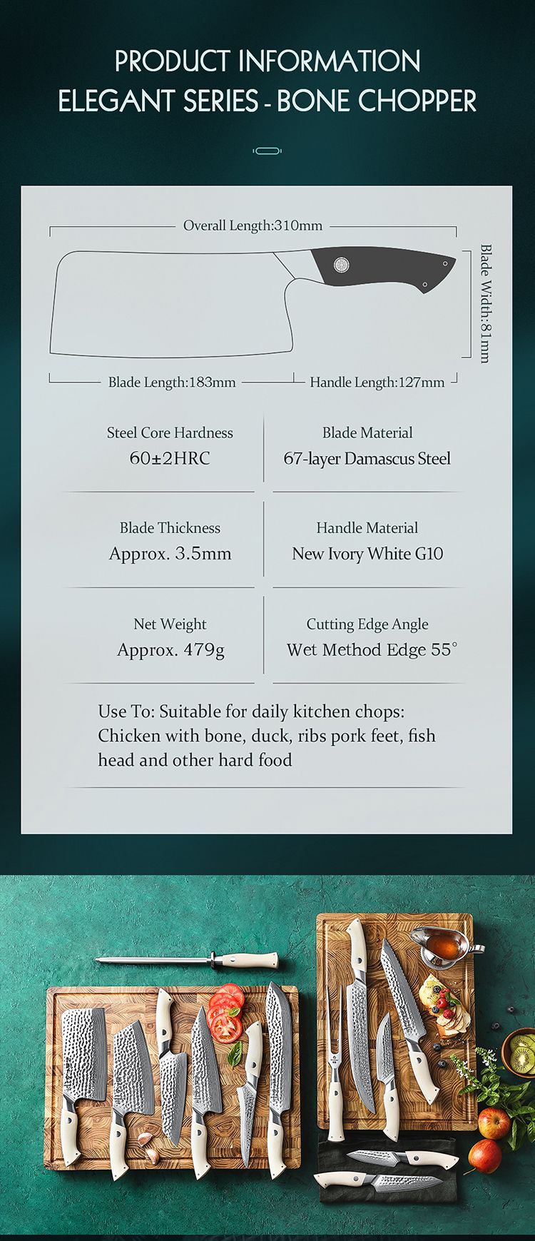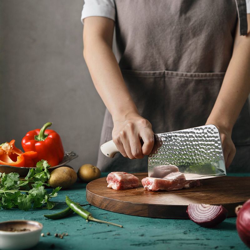 Bone Chopper нож 7 дюймов (18,3 см) - это незаменимый помощник на кухне при рубке мяса и костей, а так же при шинковке овощей. Широкая форма клинка отлично помогает использовать нож как лопатку для переноса продуктов.