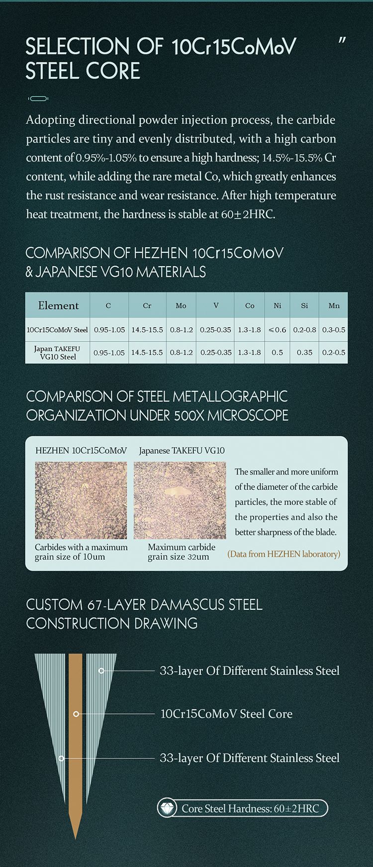 - Всего 67 слоев композитной стали, твёрдость 60–62 HRC обеспечивает лучшее сохранение режущей кромки.