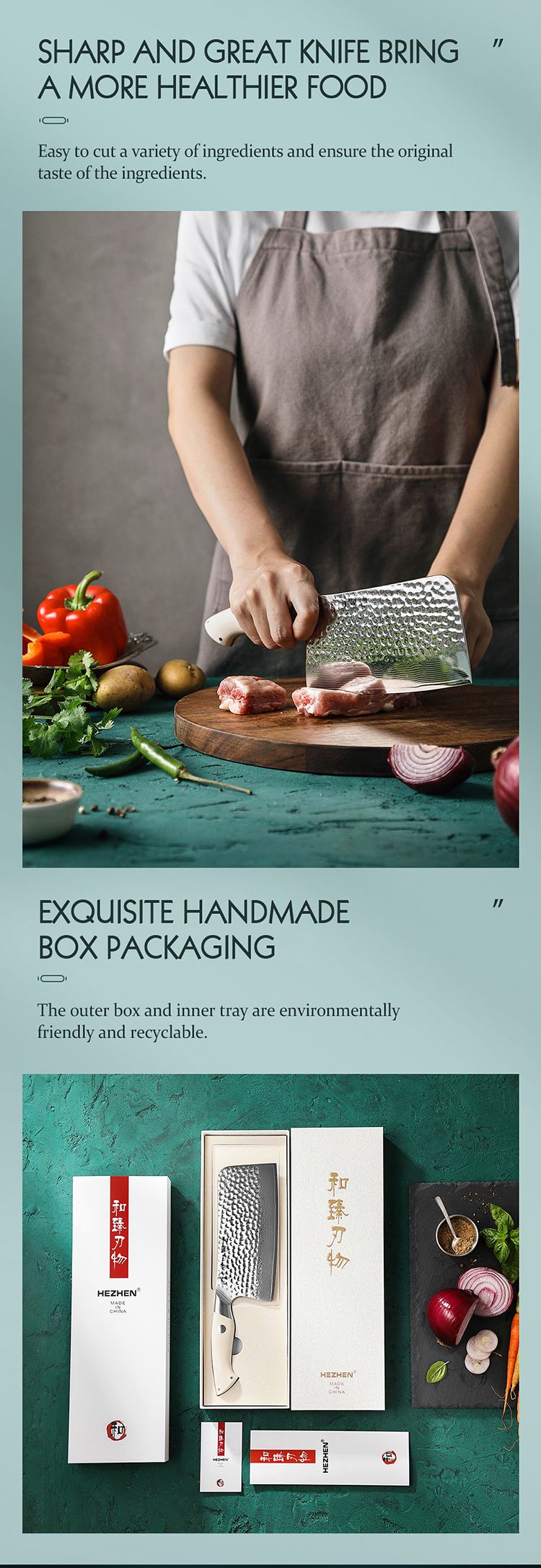 Бренд Hezhen основан на идее сделать исключительные ножи доступными для людей по всему миру. Мы считаем, что качественные инструменты не должны рассматриваться и оцениваться как символы статуса, а как инструменты для улучшения жизни людей. Качественные острые ножи делают приготовление пищи проще, безопаснее и веселее. Наша цель - улучшить жизнь людей и их отношение к приготовлению пищи благодаря нашей изобретательности, качеству и дизайну. Исследования показывают, что обычные люди в среднем тратят много лет своей жизни на приготовление пищи. Наша миссия - предлагать ножи самого высокого качества широкому кругу потребителей, начиная от однолезвийных стальных лезвий и заканчивая чрезвычайно сложными многослойными суперсталями. Улучшать жизнь людей, по одному ножу за раз, от шеф-поваров мирового класса до любящих мам и бабушек.