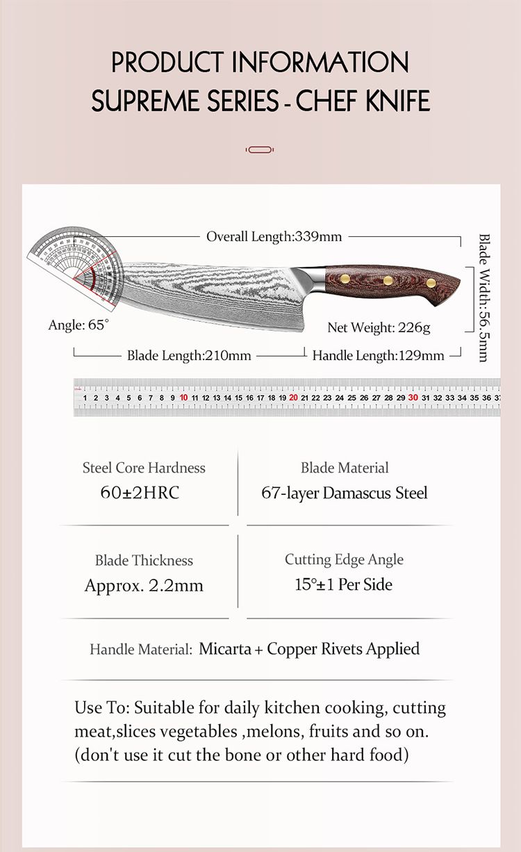 Chef нож 8,5 дюймов (21 см) - это шеф нож, король на кухне и верный помощник любого повара, который идеально подходит нарезки овощей и мяса. Широкая форма клинка отлично помогает использовать нож как лопатку для переноса продуктов.
