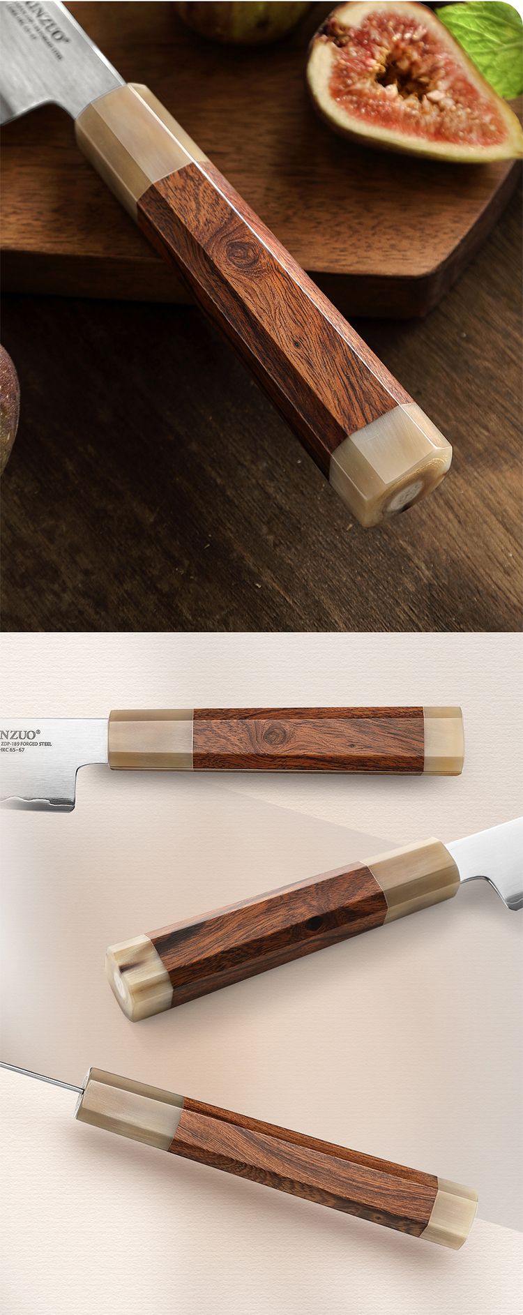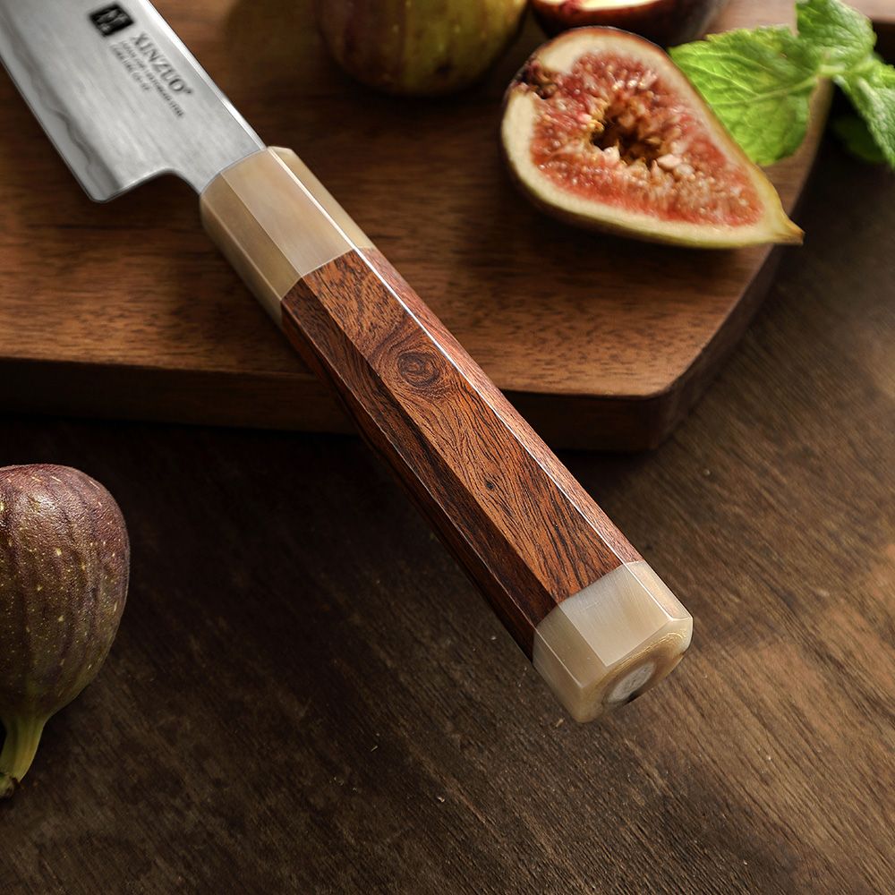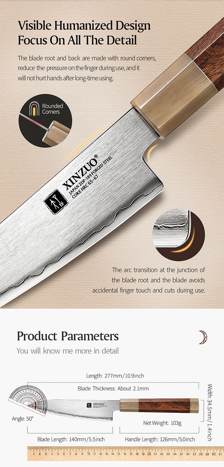 - Классический японский дизайн восьмиугольной ручки. Внедрение новшества в классический дизайн восьмиугольной ручки, разрушение стереотипного образа традиционных кухонных ножей с восьмиугольной ручкой, средняя часть с использованием пустынного железного дерева и белого бычьего рога на двух концах ручки, чтобы избежать усадки и разрыва традиционного белого бычьего рога. После многих этапов ручной полировки ручка имеет нежную текстуру и удобный хват.