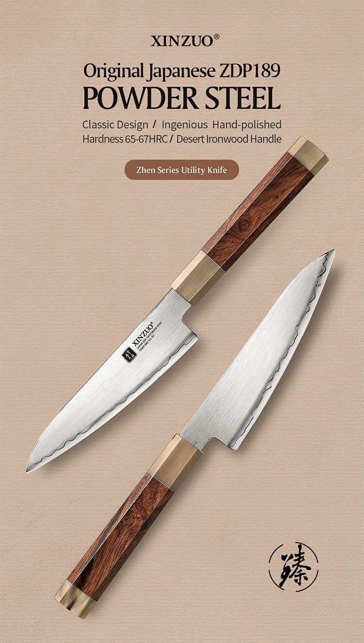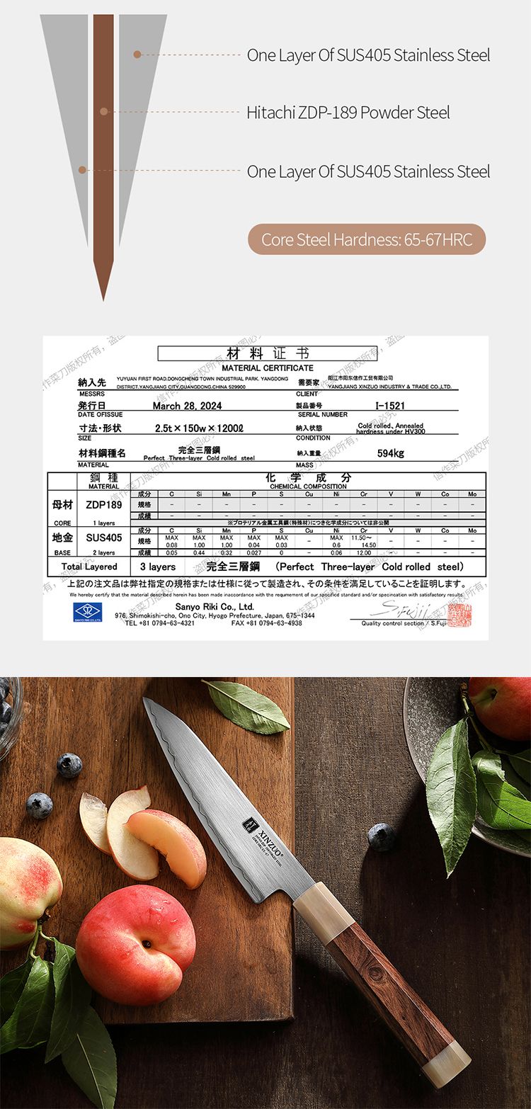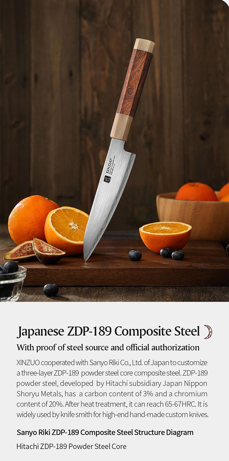 - Японская порошковая композитная сталь ZDP-189 XINZUO сотрудничала с Sanyo Riki Co, Ltd. Of Japan для изготовления на заказ трехслойной порошковой композитной стали с сердечником из стали ZDP-189. Порошковая сталь ZDP-189, разработанная дочерней компанией Hitachi Japan Nippon Shoryu Metals, имеет содержание углерода 3% и содержание хрома 20%. После термообработки она может достигать 65-67HRC. Она широко используется кузнецами для изготовления высококачественных ножей ручной работы на заказ.
