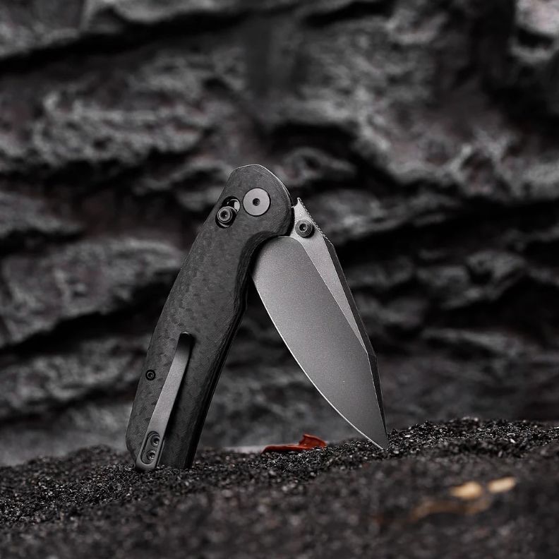 - Рукоять выполнена из алюминия и накладками из G10 в стиле Carbon.